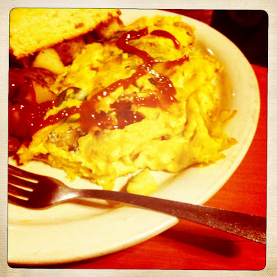 Just kidding. Pancakes are on the menu, but we decided to get our egg on. I need to get some veggies in, so I went with the #43, with zucchini, mushrooms, spinach, tomatoes and avocado. With a side of home fries. Jeff went Southwest with the #54: Chunky salsa, season ground beef, cheese and onion. Unlike so many breakfast joints that are way too heavy handed on the cheese, they used a “normal” amount. We left feeling good, and not overstuffed.