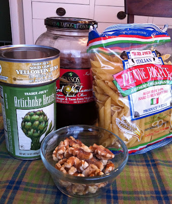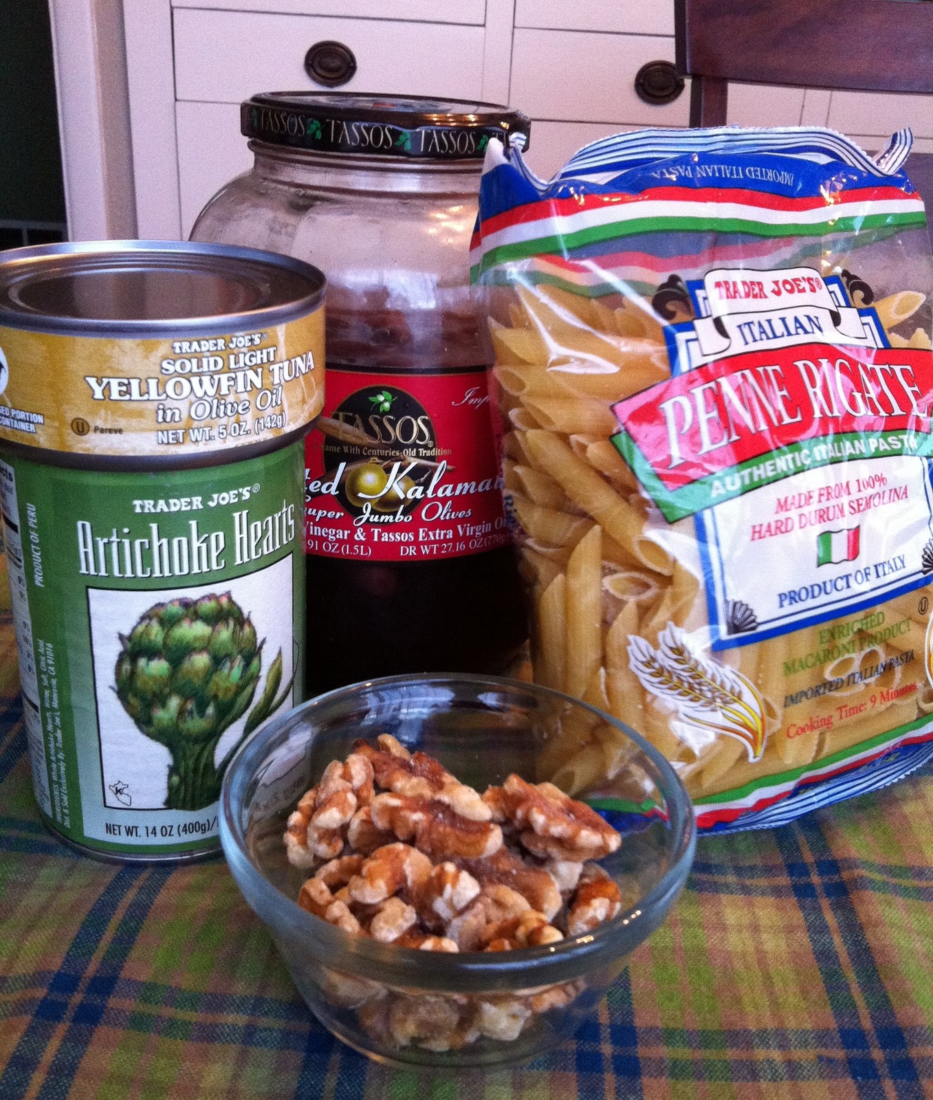 Number three got dinner from stove to table in record time last night, thanks to a well-stocked pantry.* My inspiration was a can of olive oil-packed tuna from Trader Joe’s.** While I cooked some penne pasta, I quartered some kalamata olives (a pseudo pantry staple, since olives keep practically forever in the fridge) and a can’s worth of artichoke hearts, then threw them in a bowl with the tuna (undrained) and some walnuts. When the pasta was done, I threw that in the bowl, too, along with a little salt and pepper and some grated Parmesan cheese. I served it with some roasted mushrooms and broccoli on the side, but a green salad would have worked, too. Easy peasy, and delicious. And almost no brainpower required!