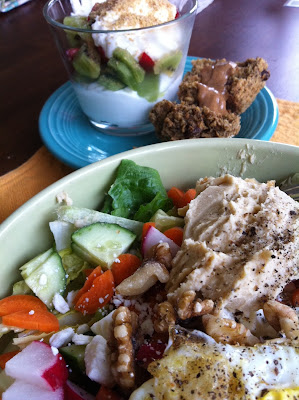 I made a pseudo-Greek salad for lunch with some romaine I already had, along with fresh cucumber, carrot, radish, some hummus, feta cheese, walnuts and an egg (courtesy of the backyard hens). Accompanied by one of the kiwis and a few strawberries with some nonfat plain Greek yogurt, and a yummy sweetener-free bran muffin with a dab of almond butter. (I’ll share the muffin recipe tomorrow.)