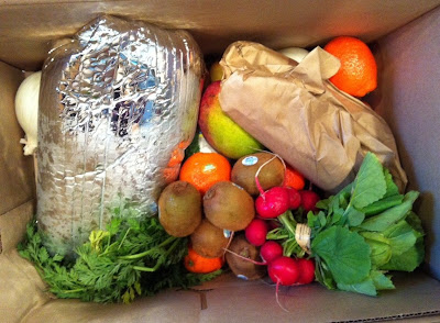 It came! It came! Our first weekly box from Full Circle came! They deliver (quietly) overnight by 6 a.m. They actually delivered around 2 a.m., when Jeff just happened to be up getting some water. He left the box on the porch until we got up at 5:45, since it was colder outside than inside.