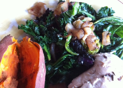 Greens braised with garlic and shallots for dinner, with roasted chicken and a sweet potato.