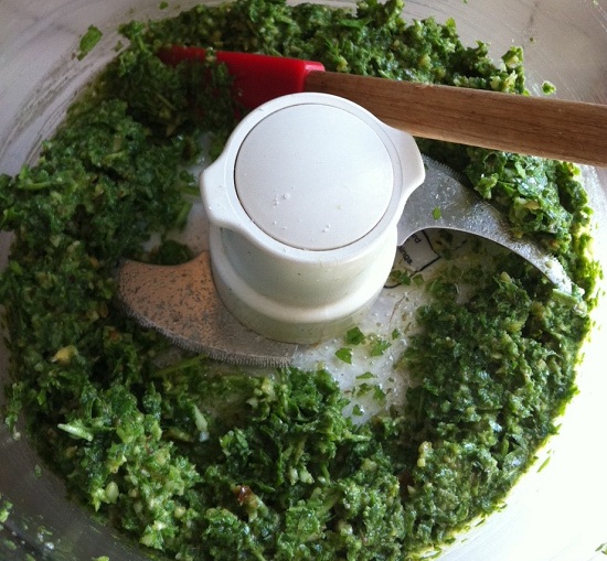 First I made basil-arugula pesto (with walnuts, garlic, olive oil, salt and a little Parmesan).
