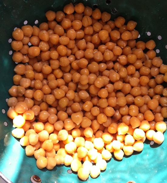 Then I made hummus. Since I hate cleaning the food processor, whenever I make pesto or puree greens, I make hummus (or another bean spread) right after. Any pesto taste in the hummus is minimal. So I get two tasty concoctions, but only have to clean the processor parts (including that nasty blade) once!