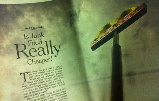 Here’s what I read on the bus yesterday on the way to “nutrition school.” Excellent, excellent opinion piece in The New York Time’s Sunday Review section by Mark Bittman, “Is Junk Food Really Cheaper?” He rather neatly, and persuasively, shoots down three big food myths: