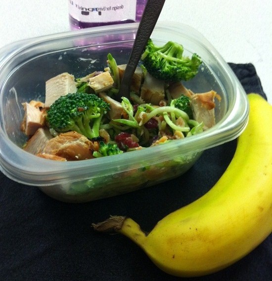 Lunch in my empty classroom in the brief break between two classes. Broccoli salad, leftover grilled organic chicken breast, banana, more water.