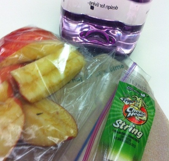 Snack during my Health and Society class. Apple and a part-skim string cheese stick. Plus water.