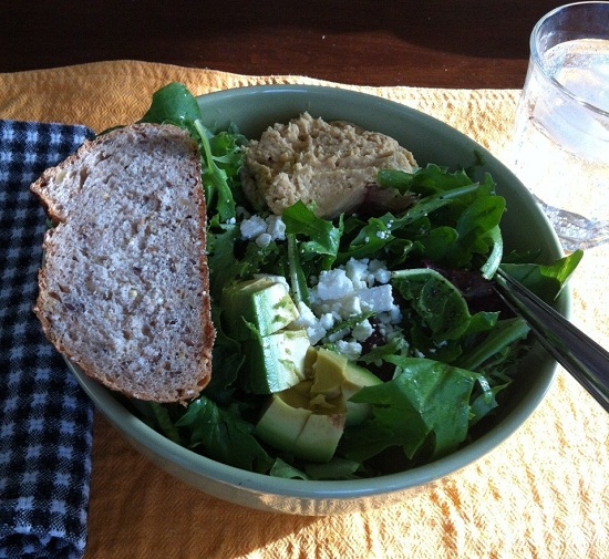 Dinner at my dining room table. Huge mixed green salad with olive oil and vinegar, hummus, avocado and feta, plus a side of multigrain bread and some sparkling water.