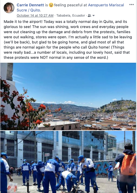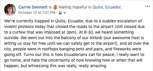 Our Airbnb host had arranged for a driver to pick us up at noon for our mid-afternoon flight. Around 10 a.m., she texted us, worried. The driver was stuck in protest blockades, and she urged us to try to get an Uber or a cab immediately. Well, the few Uber drivers who tried to get to us couldn’t, and it was just as well, as the roads to the airport were blocked. The major highway, the Ruta Viva (Live Route), was a minefield of burning tires and other debris—I saw video of protestors throwing burning branches off of overpasses. (Note: these particular protesters were NOT the indigenous Ecuadorians who were at the heart of the protest, but more violent factions, as we sadly see even with protests in the U.S.)