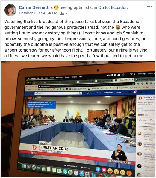 Sunday, we took a chance and booked a flight out of the Quito airport for Monday afternoon (almost every single flight Sunday to and from Quito was canceled). That afternoon, UN negotiators mediated a meeting between indigenous leaders and the Ecuadorian president. I watched the livestream of the proceedings, hopeful.