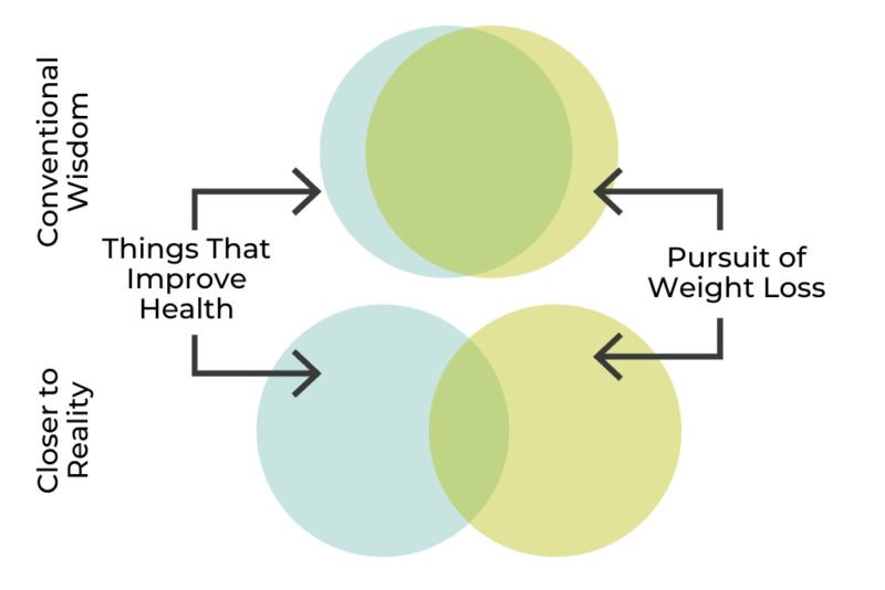 Mmmmmmm…not so much. In reality, there’s less overlap between “pursuit of weight loss” and “pursuit of long-term health” than you think.