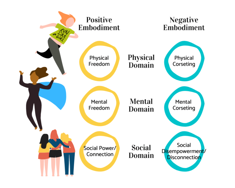 Just like you can have “good body image” or “bad body image,” you can have positive experiences of embodiment and negative experiences of embodiment. This is a little tricky to explain, so I’m going to go with some examples that illustrate this idea. (Note: you might wonder about “corseting” in the illustration below. It’s essentially the opposite of “freedom.”)