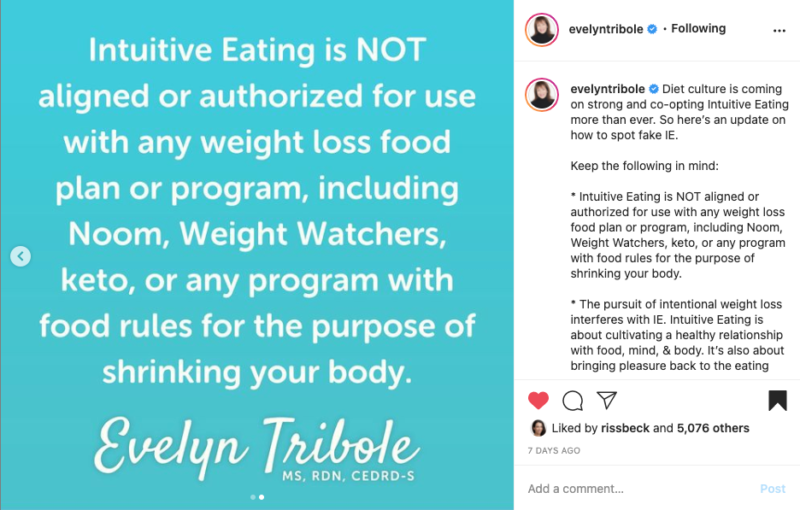 Three. Even though it’s not new, Intuitive Eating is becoming more popular, as the futility and harms of weight loss dieting become clearer and more people decide to give food restriction and their bathroom scales the heave-ho. And when something is popular, that makes people and companies want to co-opt it for their own benefit. This also happened with body positivity. There are some very popular diet plans out there that claim to use Intuitive Eating. Here’s what Evelyn Tribole had to say about that on Instagram last month (if you don’t follow her, you should):