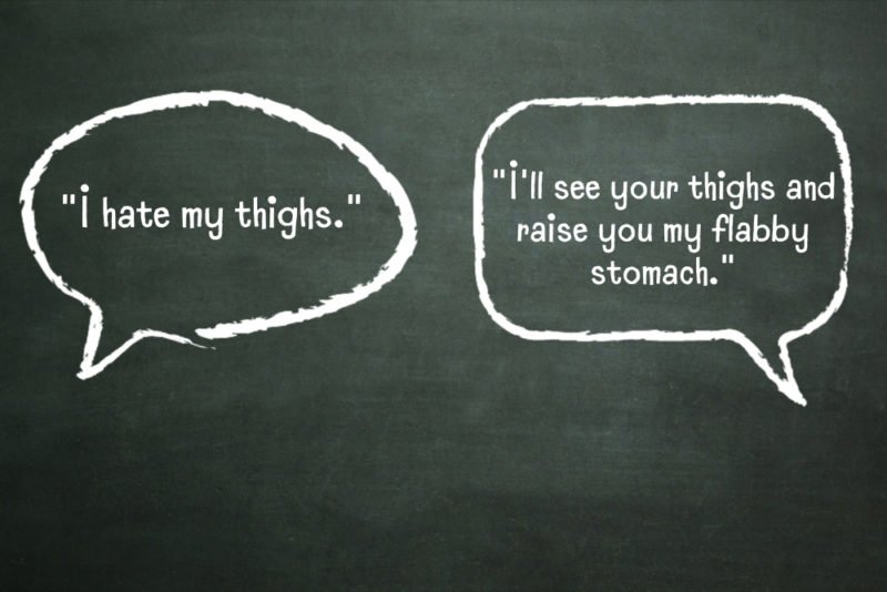 Fat talk and diet talk are also treated as normal in Western society and are reciprocal in nature. In other words, when someone complains about their thighs or their weight, whoever they’re talking with usually talks about their hated body parts and their own weight. It’s a vicious, harmful cycle.