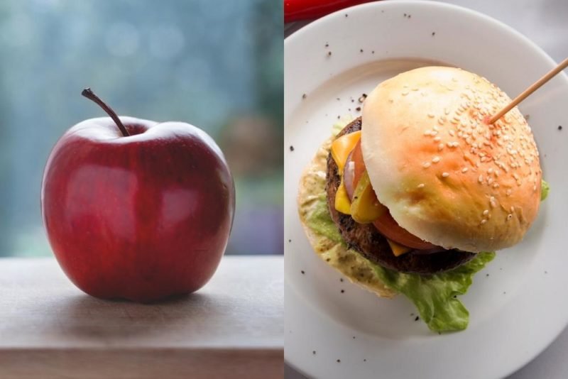 For example, what’s a better choice, an apple or a cheeseburger? The answer is not that simple. If you’re only a little hungry, maybe you’re in between meals and you need a little something to get you through, and something cool and crisp and crunchy sounds appealing, then the apple is an excellent choice.