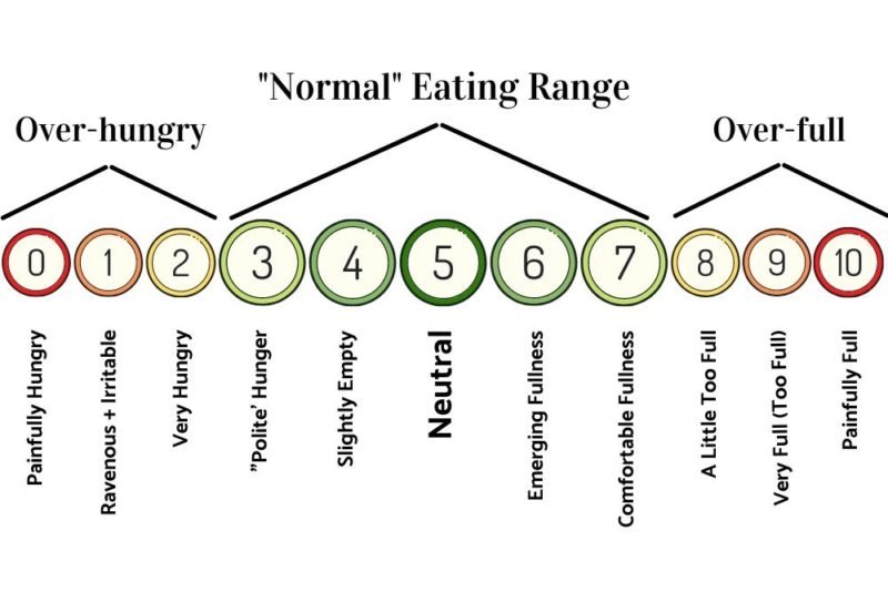 This is an example of the hunger-fullness scale used in “Intuitive Eating,” which uses a 0 to 10 scale: 0 is painfully hungry, 5 is neutral, and 10 is painfully full.