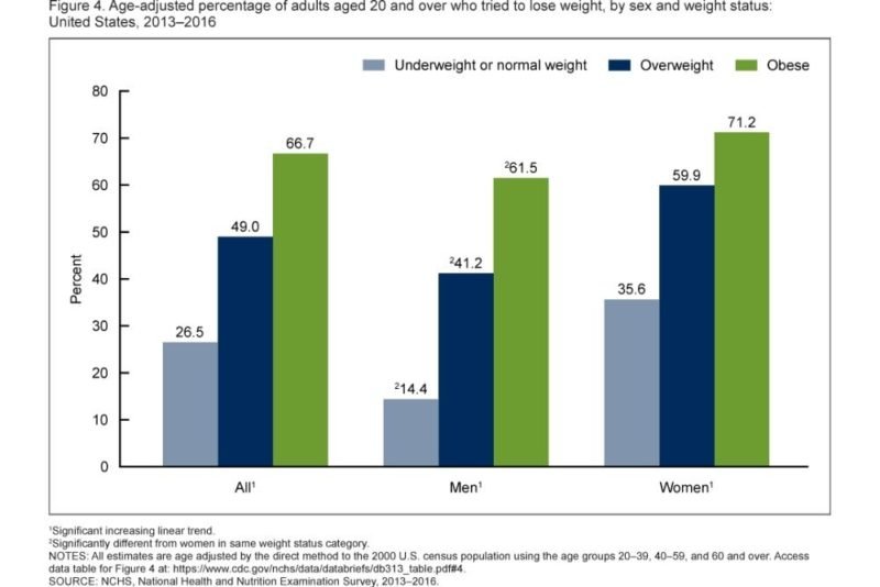 Data gathered from the National Health and Nutrition Examination Survey between 2013-2016 found that it’s not just people who have BMIs in the “overweight” or “obese” category who are trying to lose weight. More than 35 percent of women with BMIs in the “underweight” or “normal weight” categories tried to lose weight in the previous year, as shown in this graph: