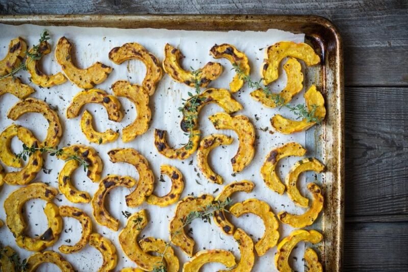 - Spread them on a baking sheet or pan large enough that the piece aren’t crowded (you want them to roast, not steam).