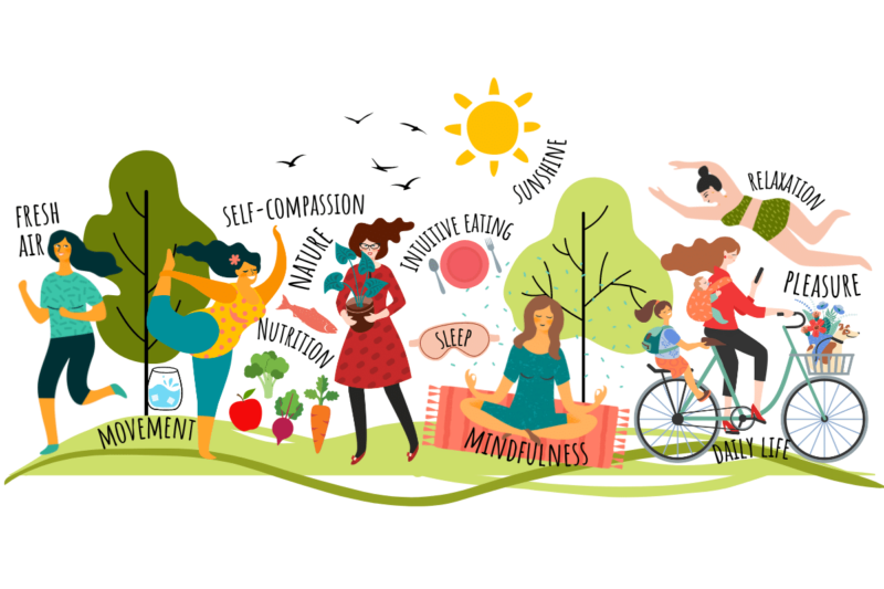 Positive embodiment includes body appreciation — having a generally favorable opinion of your body regardless of appearance — including appreciation for how our bodies function, including physical capabilities, creativity, our senses, and the fact that our hearts beat for us all by themselves. It also includes body image flexibility — being able to experience unkind feelings, thoughts and beliefs about our bodies without letting them stop us from doing things that we truly value. For example, not letting the thought “I don’t like how I look in a bathing suit” stop you from taking a fun water aerobics class or going to the beach with your kids. Another example would be not letting how you feel about your body at the moment dictate whether or not you go out with friends.