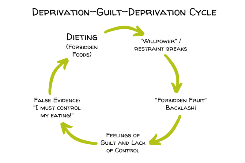 One big problem with food restriction imposed by dieting is that forbidden-food rules prevent the food habituation response. Forbidden foods remain novel and exciting, and this sets up the deprivation-guilt-deprivation cycle, pictured above. These foods may be forbidden in action (you try to keep them out of your house, for example) or in mindset (you eat them but feel like you shouldn’t be).