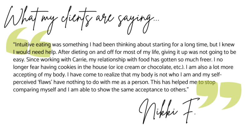 Need more help improving your relationship with food, eating and body image? Click here to schedule a free 20-minute Discovery Call to talk about your concerns, and if you would benefit from nutrition therapy.